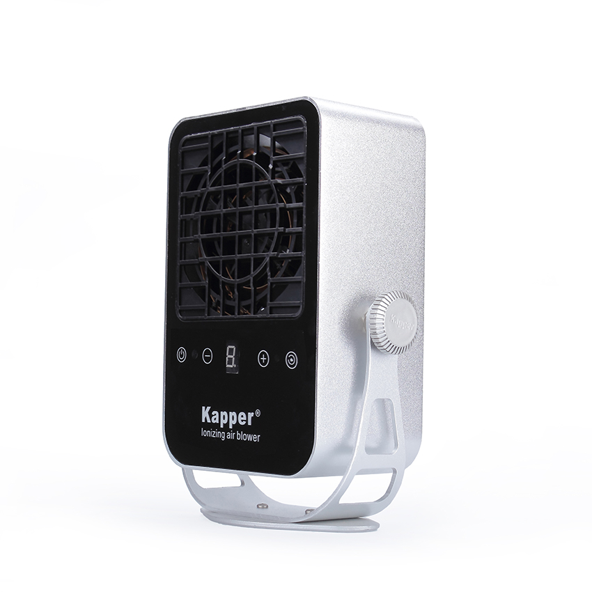 KP101A第5代智能型臺式離子風機可產生大量的帶有正負電荷的氣流,可以將物體上所帶的電荷中和掉。當物體表面所帶為負電荷,它會吸引氣流中的正電荷,當物體表面所帶為正電荷時,它會吸引氣流中的負電荷,從而使物體表面上的靜電被中和,達到消除靜電的目的。